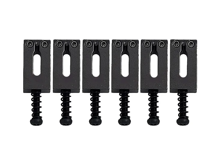Komplet sześciu, wysokiej klasy, stalowych siodełek do mostków stałych i tremolo. Na załączonym zdjęciu wymiary pojedynczego siodełka.