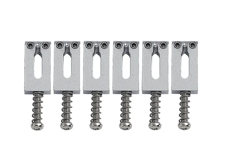 Komplet sześciu, wysokiej klasy, stalowych siodełek do mostków stałych i tremolo. Na załączonym zdjęciu wymiary pojedynczego siodełka.