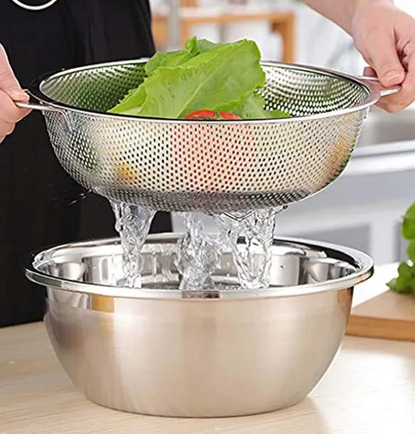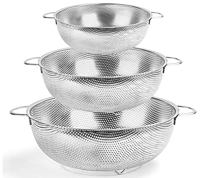 - Szybkie odprowadzanie wody i szczelna perforacja – małe otwory pokrywają powierzchnię, pomagają szybko odpływać i zapobiegają wyślizgiwaniu się małych produktów (ryż, makaron, spaghetti...) bez pozostawiania żywności w otworach. Ściana zewnętrzna jest wystarczająco mocna, aby utrzymać ciężar. Dobry pomocnik do gotowania w kuchni
