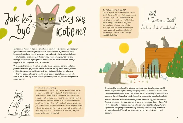 Od dzikiego nubijskiego łowcy do mruczącego przyjaciela na twojej kanapie… Jak zaczęła się przyjaźń człowieka z kotem? Dorota Sumińska, znana popularyzatorka wiedzy o zwierzętach, zaprasza młodszych i tych nieco starszych czytelników na wyjątkową wyprawę przez tysiące lat wspólnej historii ludzi i kotów. Towarzysząc kotce Sisi i jej potomkom, wędruje od dzikiej Nubii, przez starożytny Egipt, gdzie koty były czczone niczym bóstwa, i cesarskie Chiny, aż po pachnący przyprawami Cypr i resztę Europy. Odkrywa, jak na przestrzeni wieków koty stały się pełnoprawnymi członkami naszych rodzin. Książka pełna jest przyrodniczych ciekawostek i faktów, które pozwalają lepiej zrozumieć, jak wiele łączy ludzi z tymi tajemniczymi zwierzętami. Sumińska dawne rytuały, niezwykłe zachowania kotów i rolę, jaką odgrywały w różnych kulturach. Wyjaśnia, dlaczego mruczą, czemu nadal polują i co sprawia, że mimo swojej nieprzewidywalnej natury potrafią obdarzyć nas zaufaniem. To lektura idealna dla dzieci ciekawych świata, ich rodziców, a także wszystkich miłośników kotów. Mądra i inspirująca, pozwala spojrzeć na świat kocimi oczami. Ilustracje: Ola Woldańska-Płocińska