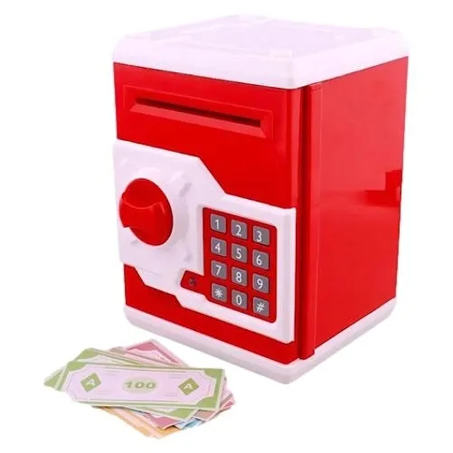 Dokonując zakupu akceptujesz poniższą ofertę:Opis ofertySejf to bardzo atrakcyjna alternatywa dla tradycyjnej skarbonki. Można w nim umieścić zarówno banknoty, jak i monety, a także wyjmować je w razie potrzeby, po wprowadzeniu odpowiedniego kodu.Na górze sejfu znajduje się specjalny otwór do wrzucania monet. Odpowiednie miejsce na banknoty znajduje się na frontowych drzwiczkach sejfu u góry. Włóż banknot do szczeliny, a zielone światełko zacznie mrugać, pieniążek zostanie wciągnięty automatycznie do środka skrytki. Jeżeli zapali się czerwone światełko i banknot się zablokuje, należy otworzyć sejf i go wyjąć. Skarbonka zabezpieczona jest specjalnym, czterocyfrowym kodem, który można nadać samodzielnie.W skrytce znajdującej się na drzwiach sejfu umieszczony jest przełącznik służący do wyboru trybu dźwięku. Dostępne są trzy tryby pracy:- Tryb cichy – wszystkie sygnały dźwiękowe są wyłączone,- Tryb bez muzyki – aktywne są jedynie sygnały potwierdzenia i błędu,- Tryb z muzyką – umożliwia odtwarzanie zaprogramowanych dźwięków po zamknięciu sejfu. Przycisk "#" aktywuje trym z muzyką, wystarczy wcisnąć dowolny klawisz od 0 do 9. Muzykę wyłącza się ponownym wciśnięciem przycisku "#".