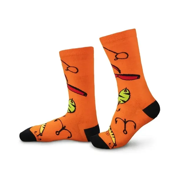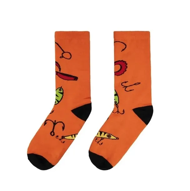 Pomarańczowe skarpety ATAK nie pozwolą zmarznąć żadnemu wędkarzowi. Dzieje się tak głównie za sprawą przedstawionego na nich motywu.
