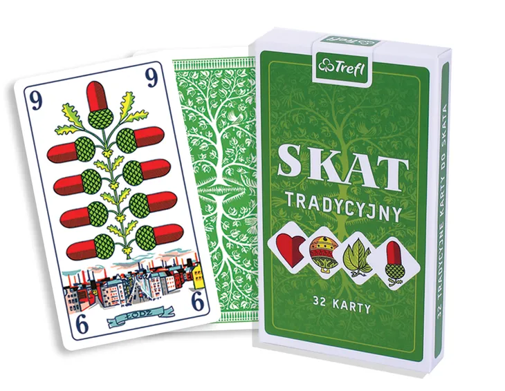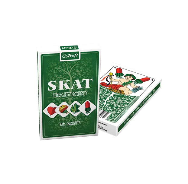 Skat, nazywany też „śląskim brydżem”, to popularna gra karciana dla 3 graczy, wymyślona w XIX wieku w Niemczech i rozpowszechniona zwłaszcza na Śląsku i Kaszubach. Na 32 kartach znajdują się kolory charakterystyczne dla talii niemieckiej, specjalne wizerunki figur oraz blotki przedstawiające znaczące miasta Polski. Gra dla wymagających graczy, którzy lubują się w rozrywce wymagającej skupienia i wytężenia umysłu.