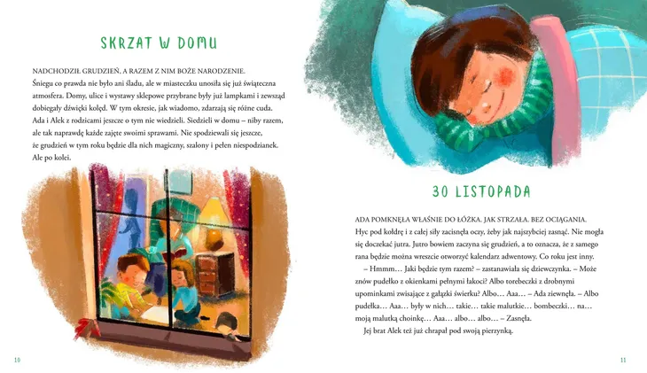 Zbliża się grudzień, a razem z nim święta. Śniegu co prawda ani śladu, ale w miasteczku czuć się już świąteczną atmosferę. Radosna krzątanina nie ogarnęła jeszcze Ady i Alka oraz ich rodziców, którzy nie wiedzą jeszcze, że grudzień w tym roku będzie dla nich magiczny, szalony i pełen niespodzianek. W tym okresie wiadomo – różne cuda się zdarzają. Zwłaszcza jeśli w domu pojawi się Skrzat… Urocza opowieść, która skradnie serca zarówno młodszych, jak i tych nieco starszych czytelników. Otuli Wasze serca ciepłem i przeniesie do świata pełnego magii, beztroskiej zabawy i niewinnych psot, które zawsze kończą się dobrze.