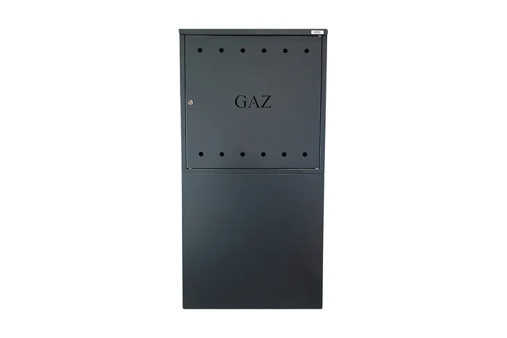 Otwory wentylacyjne i napis GAZ wycięte laserem. Skrzynka posiada tył i jest trwale połączona z postumentem maskującym przyłącza gazowe. Między postumentem, a skrzynką jest wolna przestrzeń do przeprowadzenia rur gazowych. Postument należy zakotwić na podstawie betonowej lub połączyć ze stojakiem stalowym montowanym w gruncie.