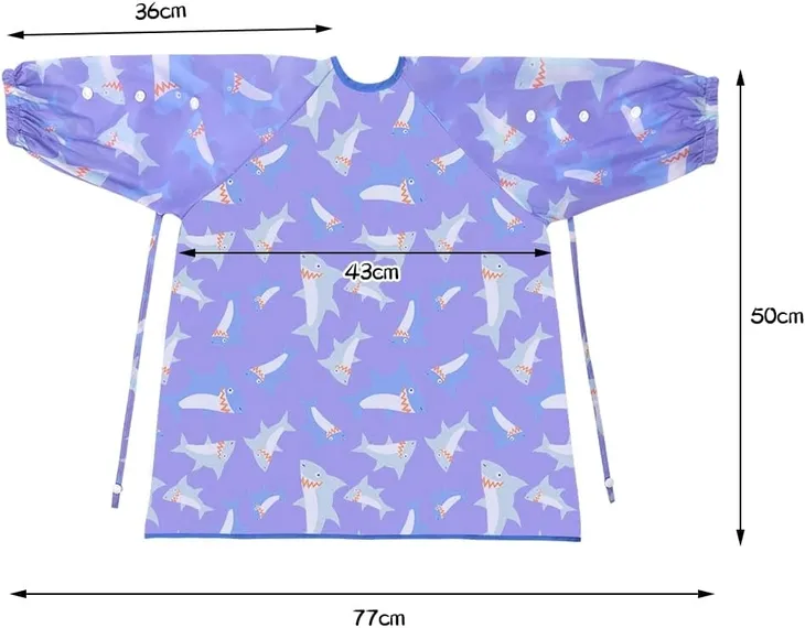 Śliniaki wyposażone są w dwie linki antypoślizgowe, które mogą utrzymać łyżeczkę dziecka, zapobiegając jej upadkowi. Dzięki temu nie musisz podnosić łyżki i widelca z podłogi, gdy dziecko uczy się ich używać. Długie rękawy i regulowany pasek na szyję ułatwiają zakładanie i dopasowanie śliniaka, a rzepy na ramionach, elastyczne mankiety i regulowane guziki umożliwiają łatwą regulację długości rękawów.