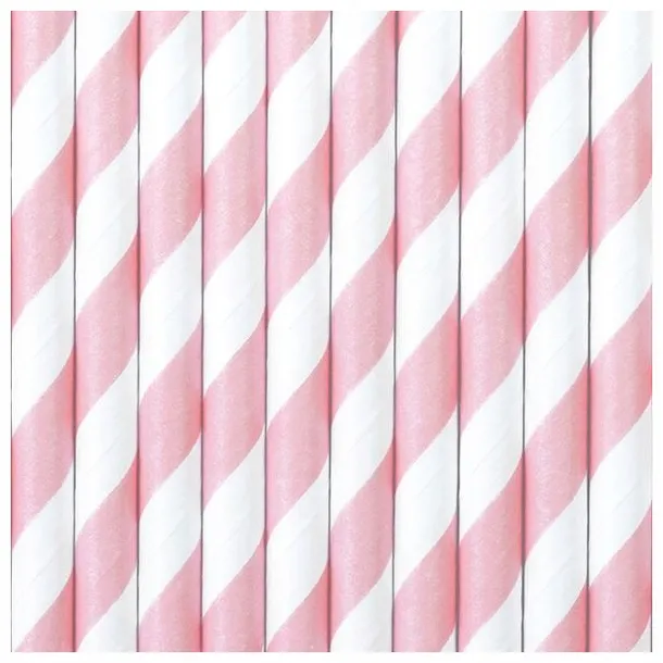 Słomki papierowe w kolorze jasnoróżowym z białymi ukośnymi paskami, długość około 19,5 centymetra.(1 op. /