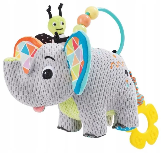 Zabawka pełna wdzięku i niespodzianek zabawi maluszka, dostarczając mu przy tym wielu sensorycznych bodźców. Słonik uszyty został z materiałów różniących się fakturą, więc głaskanie zwierzaczka stymulować będzie zmysł dotyku bobasa i rozwijać jego zdolności poznawcze. Na słoniowym ogonku zaczepiony jest miękki gryzak, którego wypustki przyniosą ulgę obolałym dziąsłom ząbkującego malucha. Grzbiet pluszaka zdobi praktyczny uchwyt w formie pałąka z zawieszonymi na nim ruchomymi koralikami do przesuwania. Słonik w kolorowym opakowaniu sprawdzi się idealnie na prezent dla każdego dzidziusia. Produkt przeznaczony jest dla dzieci od dnia narodzin. Cechy produktu: koraliki do przesuwania;doczepiony gryzaczek;szeleszczące uszy;wibracja (pszczółka do pociągnięcia);wygodny uchwyt;zróżnicowane faktury materiałów;dzwoneczek we wnętrzu zabawek;wiek: 0m+