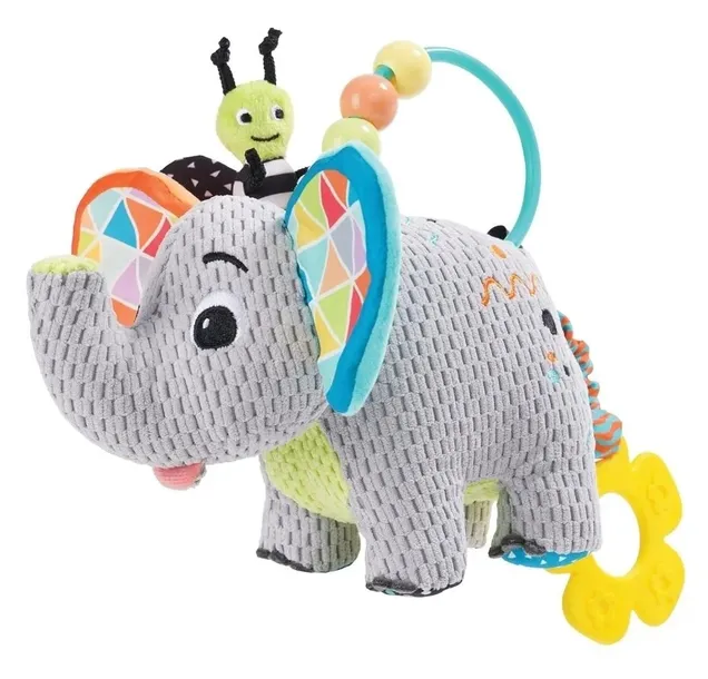 Zabawka pełna wdzięku i niespodzianek zabawi maluszka, dostarczając mu przy tym wielu sensorycznych bodźców. Słonik uszyty został z materiałów różniących się fakturą, więc głaskanie zwierzaczka stymulować będzie zmysł dotyku bobasa i rozwijać jego zdolności poznawcze. Na słoniowym ogonku zaczepiony jest miękki gryzak, którego wypustki przyniosą ulgę obolałym dziąsłom ząbkującego malucha. Grzbiet pluszaka zdobi praktyczny uchwyt w formie pałąka z zawieszonymi na nim ruchomymi koralikami do przesuwania. Słonik w kolorowym opakowaniu sprawdzi się idealnie na prezent dla każdego dzidziusia.