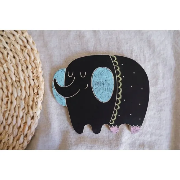 Do każdej tabliczki dołączona jest kreda w czterech kolorach. Tabliczka z jednej strony jest pokryta farbą tablicową i posiada wygrawerowane elementy, z drugiej natomiast jest biała.