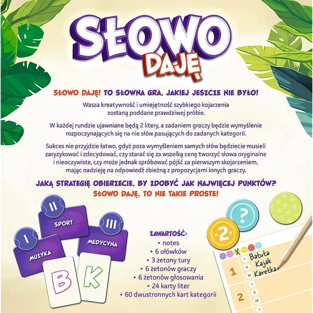 Słowo Daję! to rodzinna gra ze słowami w roli głównej, która Was zaskoczy. Gotowi na główkowanie? Sprawdźcie swoją umiejętność szybkiego kojarzenia oraz kreatywność.