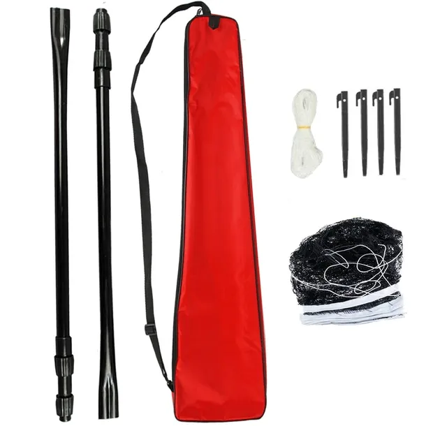 W komplecie: teleskopowe słupki , odciągi, szpilki oraz siatka. Wszystko zapakowane w wygodny pokrowiec.