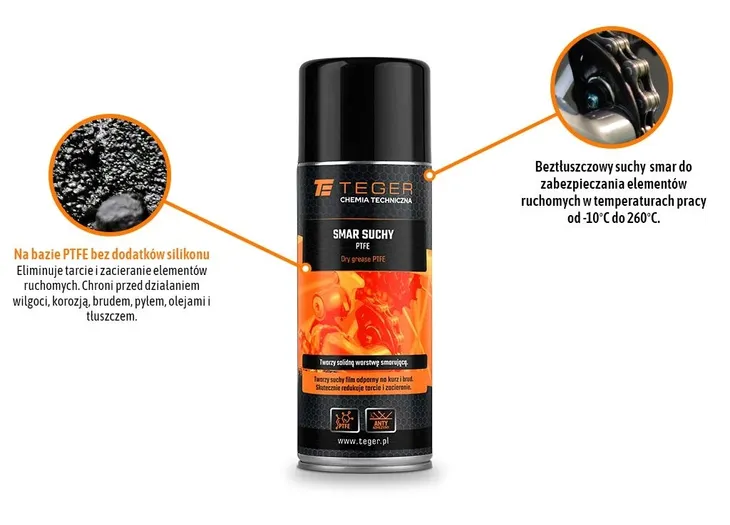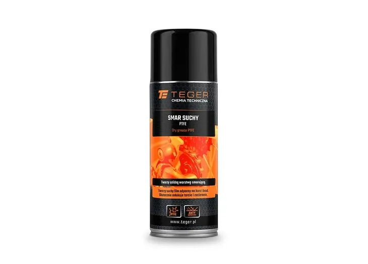 Smar suchy PTFE 400 ml / TEGER Beztłuszczowy, suchy smar na bazie związków PTFE. Eliminuje tarcie i zacieranie elementów ruchomych. Chroni przed działaniem wilgoci, korozją, brudem, pyłem, olejami i tłuszczem. Wysoka tolerancja na działanie temperatur, nie zawiera silikonu, działa antykorozyjnie, beztłuszczowy i antyadhezyjny. Sposób użycia: Pojemnik przed użyciem wstrząsnąć przez ok 1 min. Rozpylać z odległości 20-30cm, nanosząc cienką warstwę. Odczekać 10 min do wyschnięcia powłoki. Utylizacja: Zawartość/pojemnik usuwać do autoryzowanego punktu utylizacji odpadów zgodnie z krajowymi przepisami.