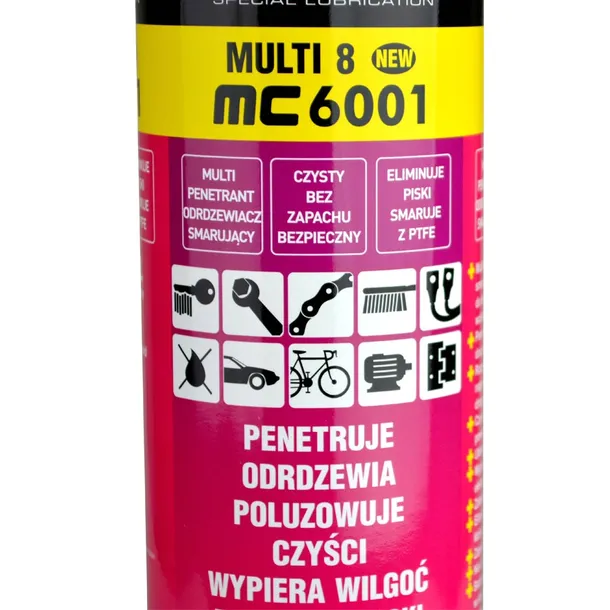 - MULTI-8 MC-6001 jest niezastąpiony w każdym warsztacie mechanicznym. Odrdzewiacz MULTI-8 polecany jest do demontażu zapieczonych, zakleszczonych lub skorodowanych śrub, nakrętek, sworzni, przegubów, do konserwacjii smarowania urządzeń mechanicznych, smarowania zamków, zawiasów, drobnych mechanizmów.