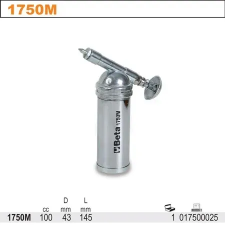Dane techniczneProducent: BetaKod producenta: BE1750MD mm: 43cc: 100L mm: 145Mini smarownica 100ml Beta 1750MCechy produktu:- Z dyszą o bardzo małej średnicy- Odpowiednia szczególnie do narzędzi pneumatycznych- Pojemność: 100 ml- Świetnie sprawdza się w codziennej pracy**Zdjęcia poglądowe