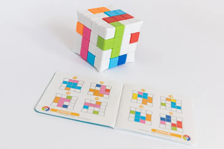 Smart Games Plug & Play Puzzler (PL) IUVI Games - Plug&Play Puzzler teraz w nowym pudełku!Plug&Play Puzzler to gra logiczna, w której sprawdzisz swoje zdolności konstrukcyjne i... wyobraźnię.Wyjmij kolorowe elementy i... spróbuj umieścić je z powrotem. Zero przygotowania - po prostu baw się dopasowując klocki! Brzmi prosto? Jest ponad 50 sposobów na ukończenie całej kostki, a niektóre z nich mogą być naprawdę trudne do odgadnię miłośników wyzwań czeka również 48 zadań! Czy zdołacie rozwiązać je wszystkie?Za co Twoje dziecko pokocha tę grę?Proste zasady - masa zabawyRozwija zdolności analityczneDoskonała do podróżySpis komponentów:biała rama kostki8 kolorowych klockówksiążeczka z 48 zadaniami i ich rozwiązaniamiOpakowanie w wersji angielskiej, produkt zawiera instrukcję z zasadami gry w języku polskim.