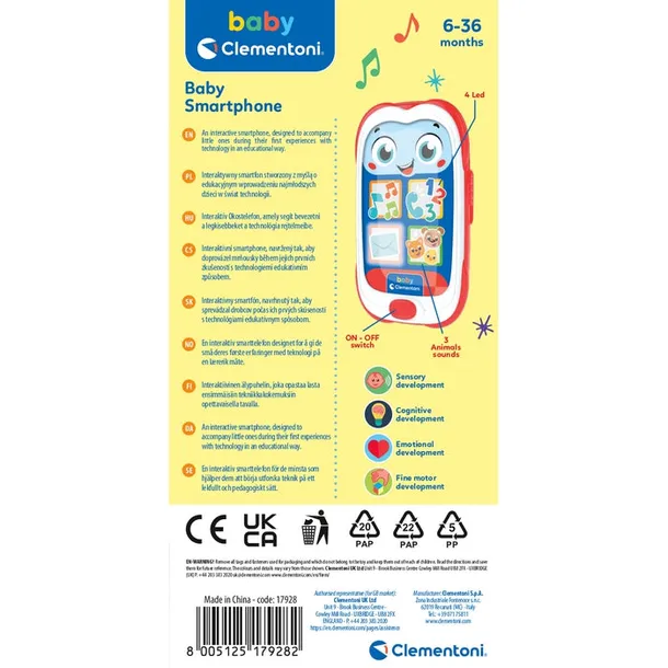 Zabawny elektroniczny telefonik z ekranem ozdobionym ilustracjami, przypominający prawdziwy telefon dla dorosłych. Posiada wiele interaktywnych funkcji, dźwięków i melodyjek. Wprowadza do nauki liter i cyfr, uczy odgłosów zwierząt: pieska, kotka i ptaszka. Stymuluje sprawność manualną, zmysł wzroku i słuchu. Pomaga rozwijać umiejętność mówienia. 4 duże podświetlane przyciski na ekranie i jeden klawisz muzyczny umieszczony na podstawie telefonu.