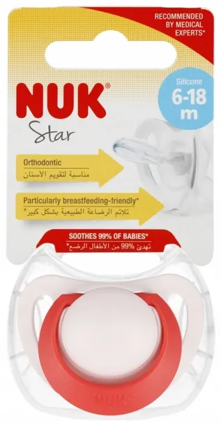 Niestety, niemowlęta nie mogą wyjaśnić, dlaczego kochają swój NUK Star tak bardzo. Ale podejrzewamy, że przyczyną jest miłe uczucie w buzi - górna część smoczka dopasowuje się delikatnie do podniebienia. Znajduje się tam miękka strefa, materiał smoczka jest bardzo cienki i wyjątkowo gładki. Jednocześnie dolna część smoczka pozostawia wystarczająco dużo miejsca dla naturalnych ruchów ssących. Ponieważ gumka smoczka jest wąska i spłaszczona, prawie nie ma nacisku na zęby oraz szczękę. W zestawie znajduje się wytrzymałe pudełko wielokrotnego użytku do bezpiecznego i czystego przechowywania. Występuje w różowym kolorze. Opakowanie jednostkowe zawiera 1 sz. silikonowego smoczka od 6-18m wraz z pudełkiem. Wymiary/waga: wymiary opakowania dł. x wys. x gł. cm : 6x11x5, waga produktu w opakowaniu kg : 0,02 kg. Produkt przeznaczony dla dzieci w wieku: 6-18m. Pakowany w pudełeczko z zawieszką. Wyprodukowano w Niemczech.