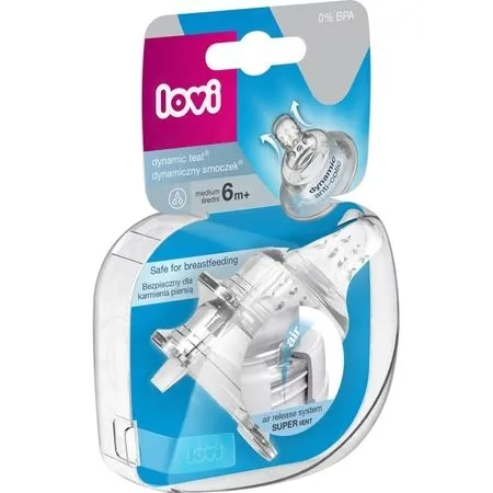 Dynamiczny smoczek LOVI, z systemem Super Vent, o średnim przepływie, do podawania odciągniętego mleka mamy, powstał w wyniku badań z udziałem lekarzy oraz neurologopedów. Jest zbudowany z niejednorodnych warstw silikonu. Miękka końcówka wydłuża się i kurczy pod wpływem ssania, co mobilizuje mięśnie jamy ustnej niemowlęcia do aktywnej pracy podczas jedzenia. Podstawa smoczka jest wykonana z grubszej i twardszej warstwy silikonu i stanowi stabilne oparcie dla ust dziecka. Smoczek posiada system antykolkowy, który ogranicza połykanie powietrza przez dziecko. Podawanie mleka mamy dynamicznym smoczkiem LOVI jest bezpieczne dla karmienia piersią (najlepszej formy żywienia niemowlęcia), nie zaburza odruchu ssania. Wielkość smoczka i szybkość przepływu jest dostosowana dla niemowląt powyżej 6 miesiąca życia.