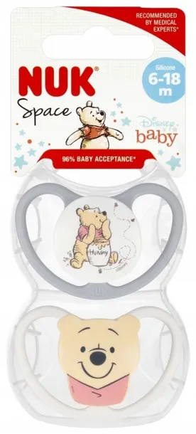 Znana na całym świecie postać z bajek Disneya Kubuś Puchatek towarzyszy dzieciom w ich codziennym życiu. Klasyczne wzory w nowoczesnym wydaniu zdobią nasze produkty oraz cieszą zarówno młodych, jak i starszych fanów. Wejdź w wyjątkowy świat Kubusia Puchatka Dzięki unikalnym motywom, smoczek NUK Space jest nie tylko delikatny dla skóry dziecka, ale również wygląda świetnie. A teraz dostępny jest z wieloma nowymi motywami. Oczywiście smoczek NUK Space ma oryginalny kształt NUK wzorowany na brodawce sutkowej matki podczas karmienia. Oznacza to, że smoczki NUK pomagają w zdrowym rozwoju jamy ustnej, akceptowane są przez 95 dzieci. Smoczek jest tak płaski, cienki i wąski, że doskonale pasuje do małej buzi dziecka pozostawiając dla języka oraz szczęki wystarczająco miejsca dla naturalnych ruchów ssących. Opakowanie zawiera 2 szt. silikonowych smoczków od 6-18m z grafiką z Kubusiem Puchatkiem. Wymiary/waga: wymiary opakowania wys. x szer. x gł. cm : 14x6x5, waga produktu w opakowaniu kg : 0,03 kg. Zestaw pakowany w przeźroczyste pudełeczko z zawieszką. Wyprodukowano w Niemczech.