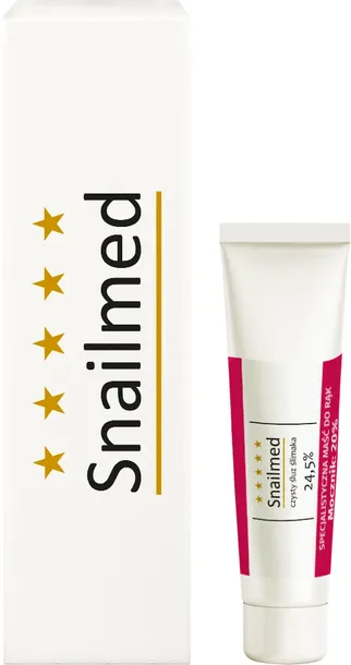 Głęboko nawilżająca, odżywczo regenerująca, maść do pielęgnacji skóry rąk, stworzona do błyskawicznych zadań. Produkt codziennej potrzeby. Precyzyjny dermokosmetyk numer jeden, w niejednej kosmetyczce. Przebadany dermatologicznie najwyższej jakości preparat dermokosmetyczny, którego jedna czwarta objętości (24,5% całej formuły) to skoncentrowany, czysty śluz ślimaka.Maść niezwykle skuteczna i wydajna w użyciu, o dobroczynnym wielokierunkowym i kompleksowym działaniu nawilżającym, łagodzącym, odbudowującym, odżywczym i regeneracyjnym. Maść, która zarówno długofalowo jak i doraźnie, wspomoże i dogłębnie odżywi skórę. Bestseller firmy Snailmed.