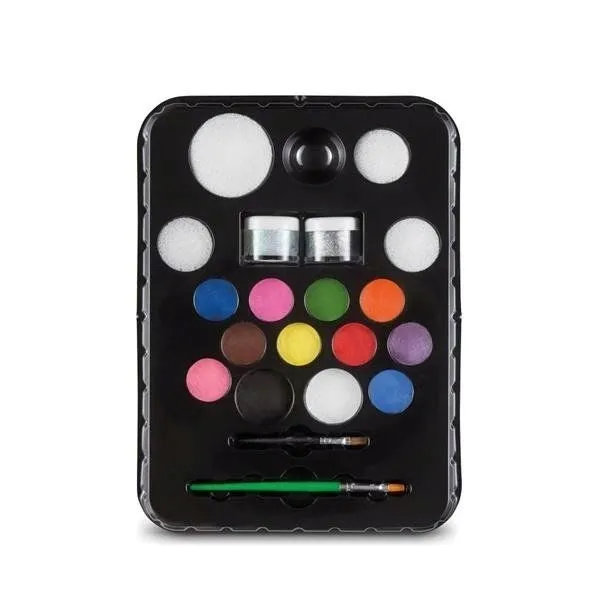 Zestaw zawiera farby do twarzy oraz żele brokatowe i akcesoria: