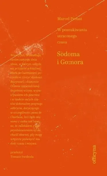 Na dziedzińcu stał sobie kwiatek i czekał na trzmiela, który by go zapylił. To się nie mogło wydarzyć, a jednak się wydarzyło. Potem jest już tylko ciekawiej. Proustowski bohater marzy o tym, aby przedstawiono go księciu de Guermantes, a zarazem lęka się, że głośno wypowiedzą jego imię. Swann jest już bardzo chory, więc ustępuje miejsca baronowi de Charlus. To brat diuka de Guermantes gra tu bowiem pierwsze skrzypce, chociaż potrzebuje do tego prawdziwego skrzypka. Bohater po raz drugi odwiedza Balbec, dogłębnie poznając hotelowy personel, a przede wszystkim klan Verdurinów. Spędza coraz więcej czasu z Albertyną, lecz pośród wahań serca powraca też myślami i we śnie do śmierci babki. Podróże po okolicy okraszone są etymologicznymi tyradami profesora Brichota, które sprawiają, że magia imion nabiera nowego znaczenia. A, i jeszcze miłość także cielesna okazuje się nie tak oczywista, jak to się zdawało. I w ogóle wszyscy są tu jakby sobą i zarazem swoją odwrotnością. Świat jest w ciągłym ruchu, niczym lokalna kolejka obwożąca pasażerów po normandzkich plażach. To świat Sodomy i Gomory najbardziej powieściowego, przygodowego tomu Proustowskiego cyklu W poszukiwaniu utraconego czasu. To także tom najbardziej chyba autonomiczny, pozwalający choć wbrew woli autora na lekturę w oderwaniu od pozostałych części. Teraz w nowym przekładzie Tomasza Swobody.