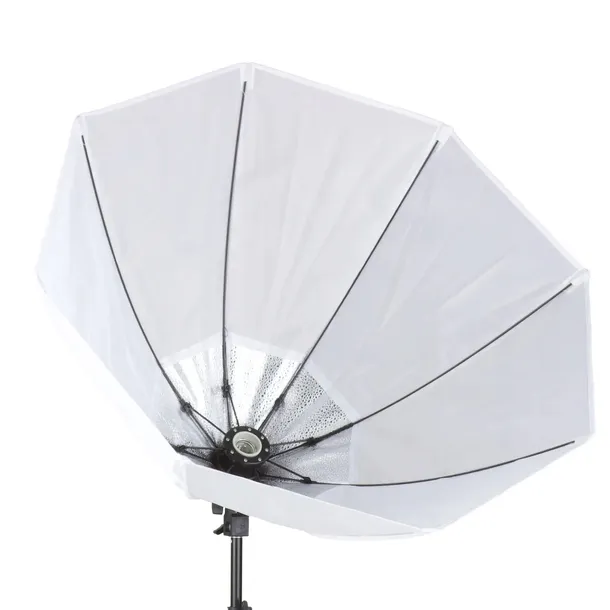 Softboks Helio™ wyróżnia się innowacyjną budową opracowaną na bazie opraw FlatLight™. Kluczową zmianą jest zastąpienie znacznej części tradycyjnego metalowego odbłyśnika tkaniną dyfuzyjną. Ta modyfikacja radykalnie zmienia propagację światła, tworząc rozległy, niezwykle miękki obszar oświetlenia o bardziej subtelnym natężeniu w porównaniu do klasycznej oktoboksa o tej samej mocy. Światło charakteryzuje się rozkładem dookólnym (360°) i dużą względną wielkością źródła.