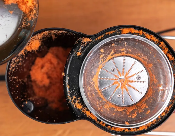 Sitko ze stali nierdzewnej o drobnej strukturze precyzyjnie oddziela miąższ od soku, tworząc aksamitną konsystencję bez grudek, a system drip-stop z uszczelką zapobiega kapaniu i rozlaniom. Wykonana z materiałów dopuszczonych do kontaktu z żywnością (certyfikat LFGB) i odpornych na kwasy owocowe, sokowirówka zachowuje higienę i niezawodność przez długi czas, nawet po wielokrotnym myciu w zmywarce.