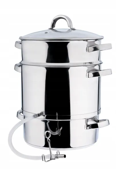 Sokownik wykonany ze stali nierdzewnej o bardzo dużej wytrzymałości. Przeznaczony do wszystkich typów kuchenek. Możliwe jest też mycie w zmywarkach. Zestaw składa się z trzech nakładanych na siebie naczyń: - w którym umieszcza się owoce, - wyposażonego w kranik spustowy spływa sok, - napełnia się wodą.