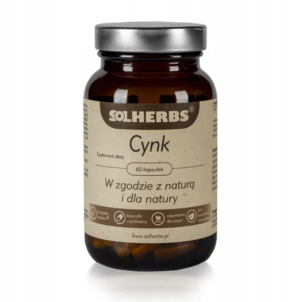 Suplement diety SOLHERBS Cynk to wysokiej jakości produkt, który stanowi naturalne źródło dobrze przyswajalnego przez organizm cynku. Preparat ten posiada również kompleks inuWex®, ułatwiający przyswajanie składników aktywnych. Zaletą tego suplementu jest również czysty skład oraz roślinna, naturalna kapsułka z pullulanu, dzięki czemu jest on odpowiedni dla wegan i wegetarian.