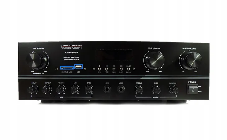 NAJNOWSZY WZMACNIACZ STEREO Z 5 WYJŚCIAMI NA KOLUMNY, WYŚWIETLACZEM LCD, PEŁNĄ REGULACJĄ BARWY DŹWIĘKU ORAZ MIKROFONÓW W TYM ECHA, TUNEREM RADIOWYM, BLUETOOTHEM, WEJŚCIEM USB I SD DO ODTWARZANIA MUZYKI ORAZ Z WEJŚCIAMI NA PODŁĄCZENIE NP. KOMPUTERA, WIEŻY, TELEFONU, TELEWIZORA ITP. W SUPER CENIE !