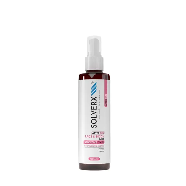SOLVERX SENSITIVE SKIN After Sun Face Body MistOferujący działanie łagodzące i nawilżające, SOLVERX SENSITIVE SKIN After Sun Face Body Mist to idealna pielęgnacja skóry po ekspozycji na słońce. Ta kojąca mgiełka przeznaczona do twarzy i ciała zawiera specjalistyczną formułę opartą na 10% pantenolu, znanego ze swojego działania przeciwzapalnego. Pantenol łagodzi podrażnienia, nawilża i zmiękcza skórę, poprawiając jej strukturę. Działanie pantenolu uzupełnia kompleks prebiotyków: inulina i alfa-glukan, które pomagają utrzymać równowagę mikrobiomu skóry i zwiększają jej odporność na czynniki zewnętrzne. Dodatkowo arginina zawarta w formule poprawia nawilżenie skóry i wzmacnia jej naturalną barierę hydrolipidową.Sposób użycia: Rozpyl mgiełkę na skórę twarzy (zamknij oczy) i ciała z odległości 15-20 cm. Stosuj kilka razy dziennie według potrzeb.
