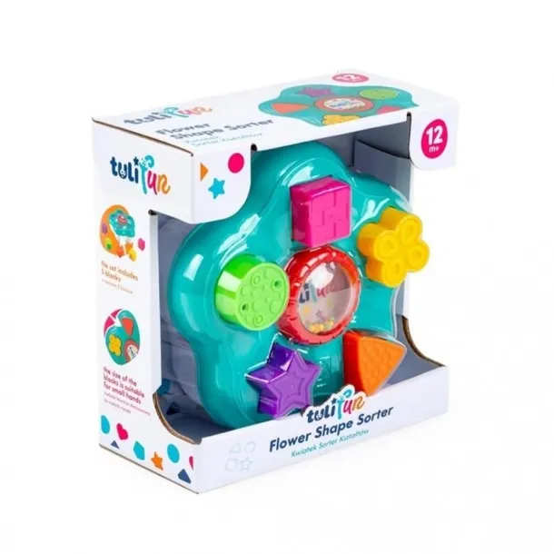 Uroczy sorter - kwiatek posiada pięć ramion, a na każdym z nim znajduje się otwór w innym kształcie. Zadanie malucha polega na dopasowaniu klocków z zestawu do odpowiednich otworów. Gdy wszystkie znajdą się we wnętrzu kwiatka, wystarczy zdjąć pokrywkę z sorterem i wysypać klocki, aby rozpocząć zabawę od nowa. Na środku pokrywy znajduje się grzechotka z koralikami, której obręcz, przy przekręcaniu, wydaje terkoczący odgłos. Praktyczny pojemnik stanowi skrytkę, w której można przechowywać klocki dołączone do zestawu.