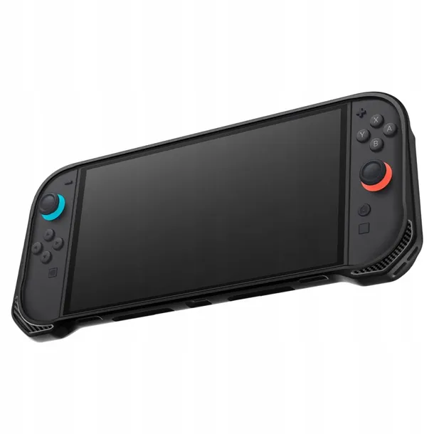 Ergonomiczny kształt oraz teksturowana, matowa powierzchnia gwarantują pewny i wygodny chwyt, co znacząco poprawia komfort użytkowania. Dodatkowo eleganckie, karbonowe detale nadają etui nowoczesny i stylowy wygląd. Precyzyjne wycięcia umożliwiają bezproblemowy dostęp do wszystkich przycisków, triggerów, portów oraz joysticków, a dołączony pasek na nadgarstek ułatwia transport konsoli w podróży.