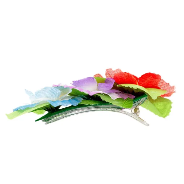 Oferujemy Państwu urokliwą spinkę hawajską, która doda wyjątkowego akcentu każdej stylizacji. Wykonana z wysokiej jakości plastiku, ma długość 7,5 cm, co czyni ją praktycznym i atrakcyjnym dodatkiem. Spinka zdobiona jest trzema kwiatami w intensywnych kolorach: czerwonym, fioletowym oraz niebieskim, które wkomponowane są w zielone listki, przywołując na myśl tropikalne klimaty. Długość ozdoby kwiatowej wynosi około 13 cm, a jej szerokość to około 8 cm.