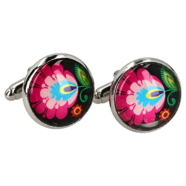 Folkowe spinki do mankietów z łowickimi kwiatami na czarnym tle to elegancki dodatek, który wyróżnia się nie tylko kolorem, ale i charakterem. Zainspirowane tradycyjnymi wycinankami z Łowicza, prezentują intensywnie kolorowy, kwiatowy motyw, pięknie kontrastujący z głębokim, czarnym tłem. Ten kontrast dodaje wyrazistości i sprawia, że wzór staje się jeszcze bardziej spektakularny.