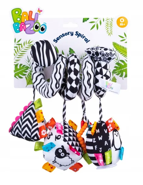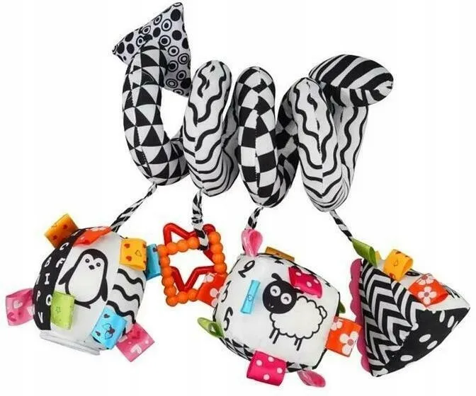 Kontrastowa spirala w magiczny sposób łączy walory rozrywkowe i edukacyjne, zapewniając Pluszakom Luzakom wspaniałą zabawę! Aż roi się tu od niespodzianek. Kontrastowe kolory pobudzają zmysł wzroku malucha, a zróżnicowane faktury materiałów, zmysł dotyku. W pluszakowych kształtach, piłce, kostce i piramidce, kryją się dzwoneczki, a piłkę dodatkowo zdobi bezpieczne lustereczko do samopoznania bobaska. Doczepiane do spirali gryzaczki przyniosą ulgę ząbkującym dzieciom. Spiralę bez trudu można owinąć wokół szczebelka ?óż przeznaczona dla dzieci od dnia zabawki:wygodne zaczepianie - możliwość zawinięcia naokoło szczebelka łóżeczkazróżnicowane faktury materiałówkolorowe metkibezpieczne lusterko do samopoznania dziecka (piłka)kontrastowe wzory stymulujące zmysł wzroku dzieckagryzakidzwonki (piłka, kostka i piramidka)wiek: 0+