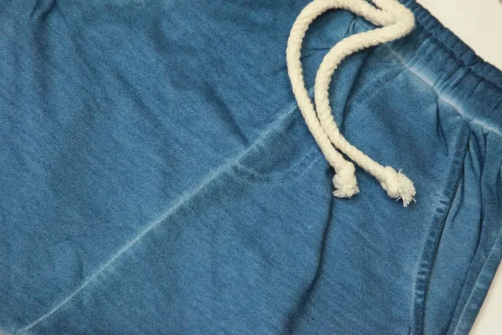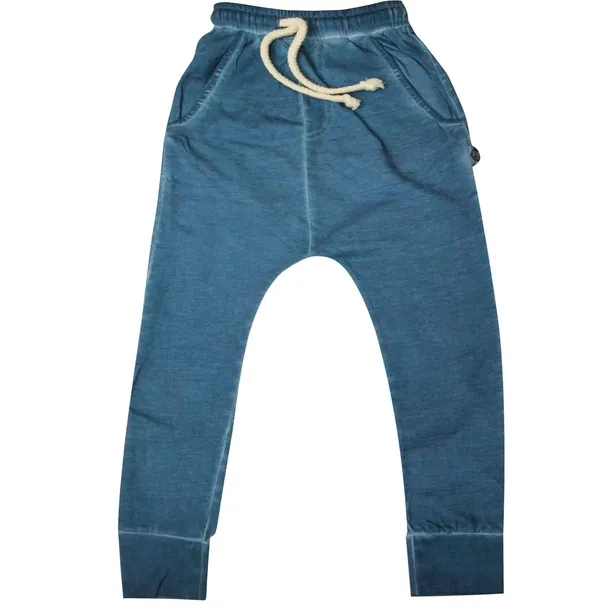 Piękne spodnie dekatyzowane o sportowym fasonie w kolorze niebieskim imitujący jeans. Obniżony krok. Zwężana nogawka. Posiadają ściągacz w pasie oraz dodatkowo sznurek, dzięki któremu możemy dopasować spodnie indywidualnie do dziecka. Bardzo wygodne, dobrze się układają.