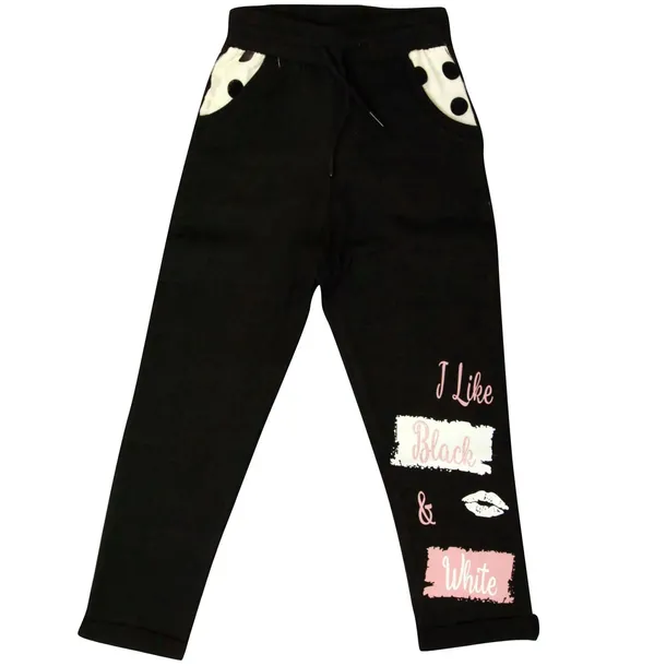 Piękne czarne spodnie o sportowym fasonie z aplikacjami na nogawce i brokatowymi napisami. Posiadają ściągacz w pasie oraz dodatkowo sznurek, dzięki któremu możemy dopasować spodnie indywidualnie do dziecka. Spodnie mają dwie kieszonki z tiulowymi wstawkami w groszki.