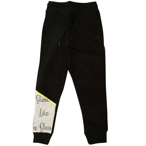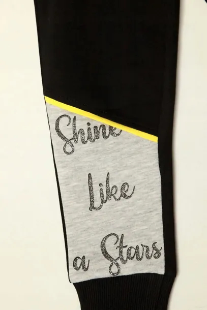 Piękne czarne spodnie o sportowym fasonie z szarą wstawką na nogawce i brokatowymi napisami. Posiadają ściągacz w pasie oraz dodatkowo sznurek, dzięki któremu możemy dopasować spodnie indywidualnie do dziecka. Spodnie mają dwie kieszonki.