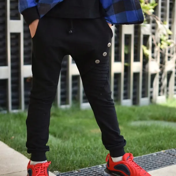 Piękne spodnie chłopięce o sportowym fasonie w kolorze czarnym z guzikami. Obniżony krok. Posiadają ściągacz w pasie oraz dodatkowo sznurek, dzięki któremu możemy dopasować spodnie indywidualnie do dziecka. Bardzo wygodne, dobrze się układają.