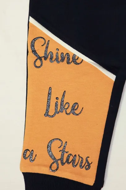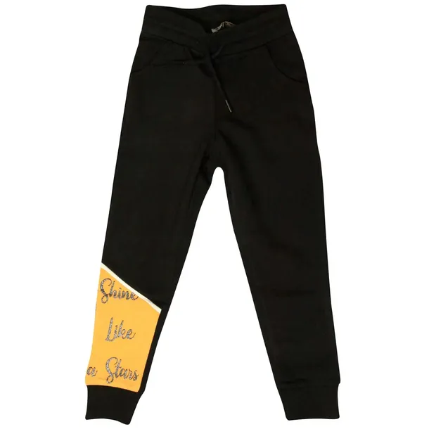 Piękne czarne spodnie o sportowym fasonie z pomarańczową wstawką na nogawce i brokatowymi napisami. Posiadają ściągacz w pasie oraz dodatkowo sznurek, dzięki któremu możemy dopasować spodnie indywidualnie do dziecka. Spodnie mają dwie kieszonki.