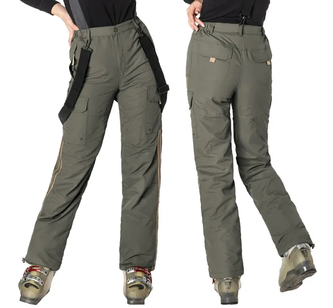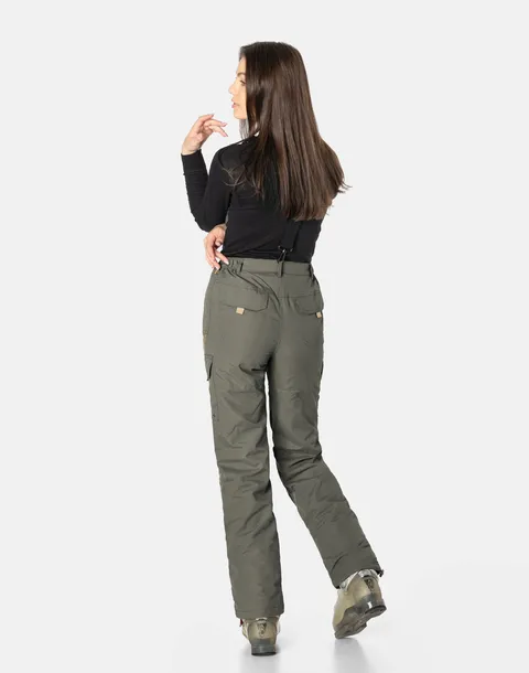 Spodnie zapinane są na metalowy nap oraz zamek błyskawiczny. Posiadają elastyczne, regulowane szelki z możliwością ich całkowitego odpięcia i aż 6 kieszeni !!! Z przodu dwie klasyczne wpuszczanie kieszenie na dłonie, zasuwane na kryte zamki błyskawiczne. Na udach kieszenie typu Cargo kryte patkami i zapinane na rzepy. Z tyłu na pośladkach dwie naszywane kieszenie kryte patkami zapinanymi na rzepy. Dopasowanie w pasie zapewnia wszyty w spodnie szeroki elastyczny pas ściągający. Krój z prostymi nogawkami i profilowanymi kolanami pozwalający dodatkowo założyć pod spód getry narciarskie. Specjalne przeszycia w spodniach uwzględniające anatomiczny kształt kolan gwarantują pełną swobodę ruchów dla narciarzy i snowboardzistów.