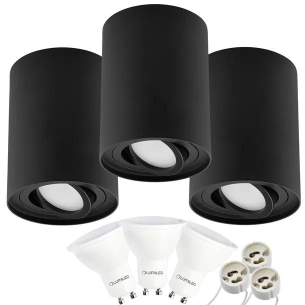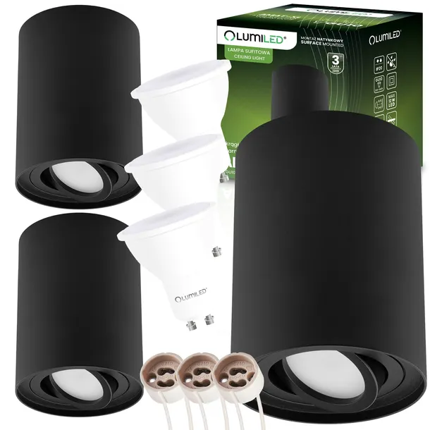 3x Oprawa Natynkowa HALOGENOWA Spot Tuba Ruchoma Okrągła Czarna 125mm + Żarówka LED GU10 6W 120° 3000K AMAT-XL LUMILED