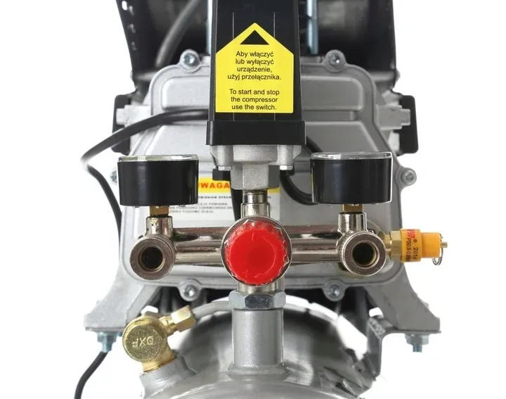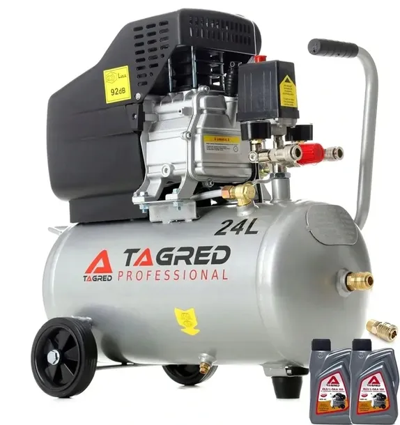 ✔️ Ergonomiczna konstrukcja z metalową rączką, kółkami i czytelnym wskaźnikiem poziomu oleju, a także 2 butelki oleju sprężarkowego TAGRED w zestawie.