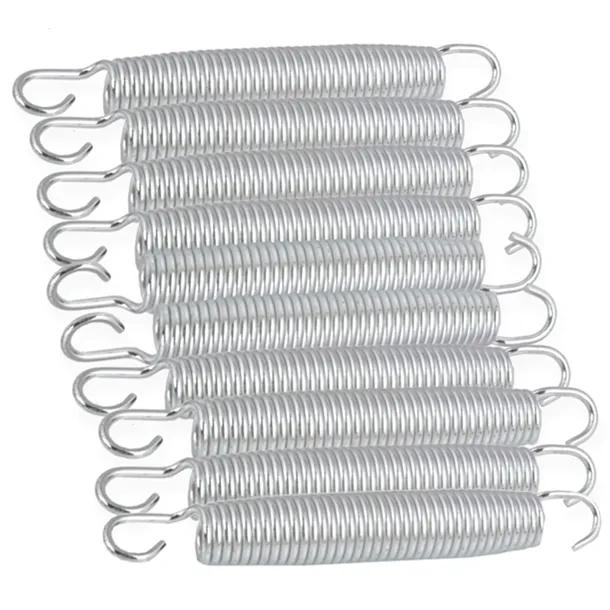 W zestawie sprężyn do trampoliny znajduje się 10 sztuk – każda o długości 145 mm i wadze 0,1 kg. Niewielka waga stalowych sprężyn zamiennych do trampoliny zapewnia bezproblemową obsługę. Montaż stalowych sprężyn zamiennych do trampoliny jest bardzo prosty i każdy sobie z nim poradzi. Każda ze sprężyn do trampoliny posiada jeden koniec z haczykiem mocniej wygiętym i drugi z haczykiem mniej wygiętym.