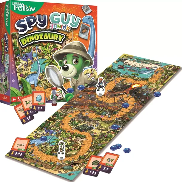 „Spy Guy Junior. Dinozaury” to kooperacyjna gra, w której wcielacie się w rolę młodego detektywa. Spróbujcie schwytać złoczyńcę, nim ten ucieknie z parku dinozaurów z niezwykle rzadkim jajem brachiozaura. Ćwiczcie spostrzegawczość, umiejętność skupienia uwagi i współpracy, poszukując poszlak na barwnej, rysunkowej ponadmetrowej planszy. Wersja Junior dedykowana jest młodszym graczom, dlatego, aby ułatwić poszukiwania, ilustracje są większe, a plansza mniej szczegółowa. Dodatkowo w opakowaniu znajdziecie atlas z dinozaurami występującymi na planszy. Spróbujcie odnaleźć je wszystkie i zapoznajcie się z ciekawostkami na ich temat. Zawartość opakowania: • plansza, • 2 pionki z podstawkami, • klepsydra, • 56 kart poszlak, • 10 znaczników poszlak, • instrukcja wraz z atlasem dinozaurów.