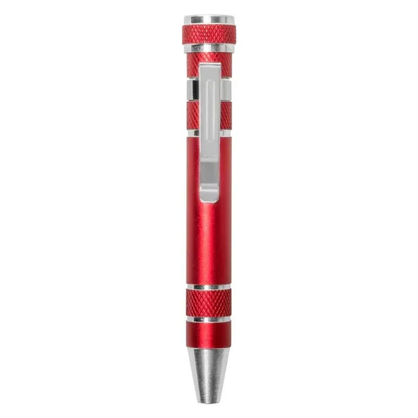 Śrubokręt w kształcie długopisu z 4 płaskimi i 4 krzyżakowymi końcówkami, z klipem