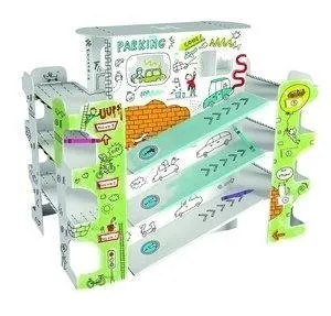 Kartonowe szablony do złożenia i pokolorowania. Dzięki zawartości tych pudełek i własnej wyobraźni dzieci stworzą niepowtarzalny parking i ozdobią go na tysiąc różnych sposobów. Można kolorować kredkami, flamastrami i farbami. Papierowe budowle mają lekką, ale stabilną i trwałą konstrukcję, a co najważniejsze, gwarantują długie godziny doskonałej zabawy. Zdjęcie pokazuje złożone i pokolorowane szablony. Wymiary parkingu po złożeniu: 410 x 320 x 485 mm